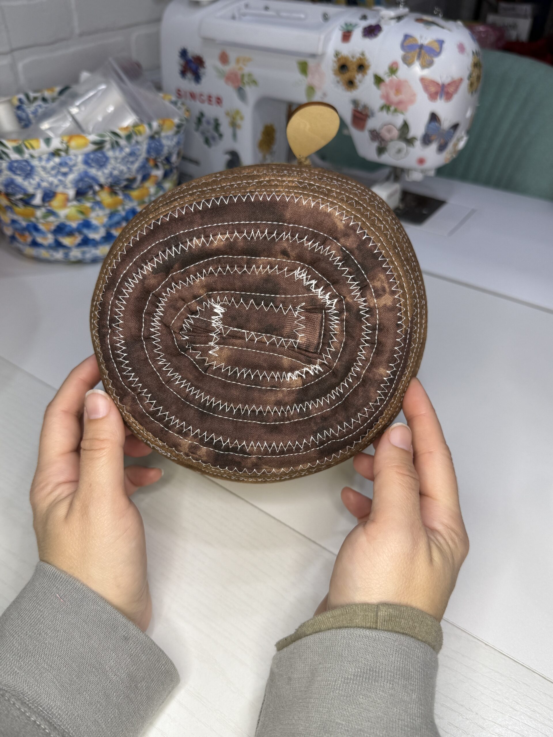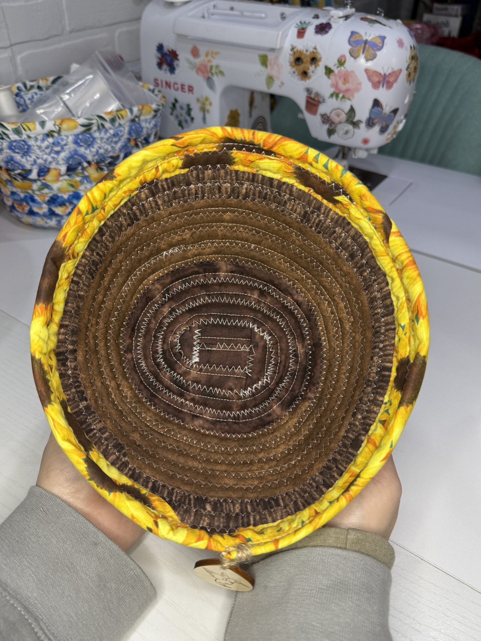 This Brown Sunflowers Fabric Bowl with Charm is handmade and is as shown. Featuring the hand drawings of Kristy engraved on the charm. Measures about 8″ at the top across and 5″ at the base and 5.5″ tall.