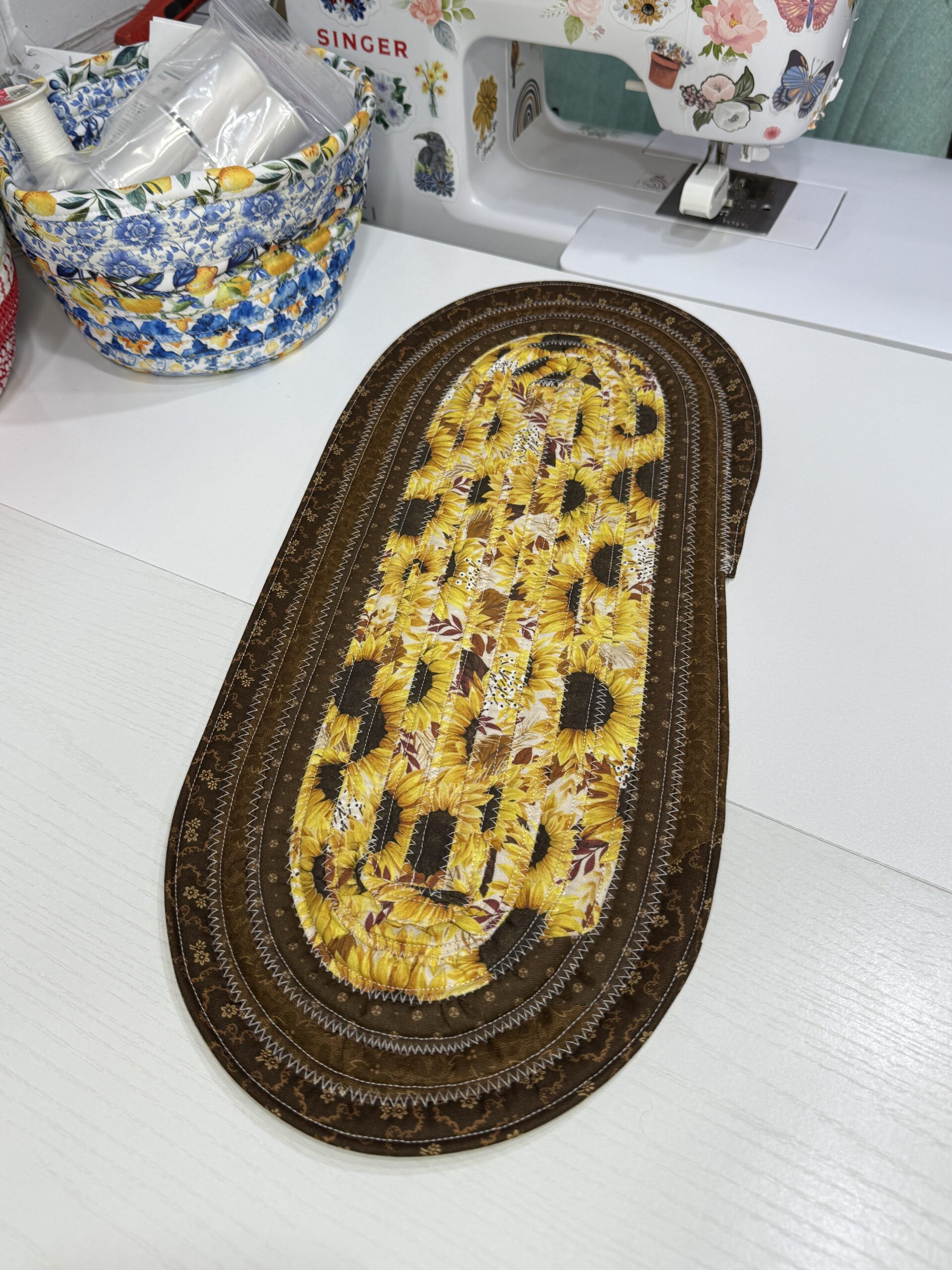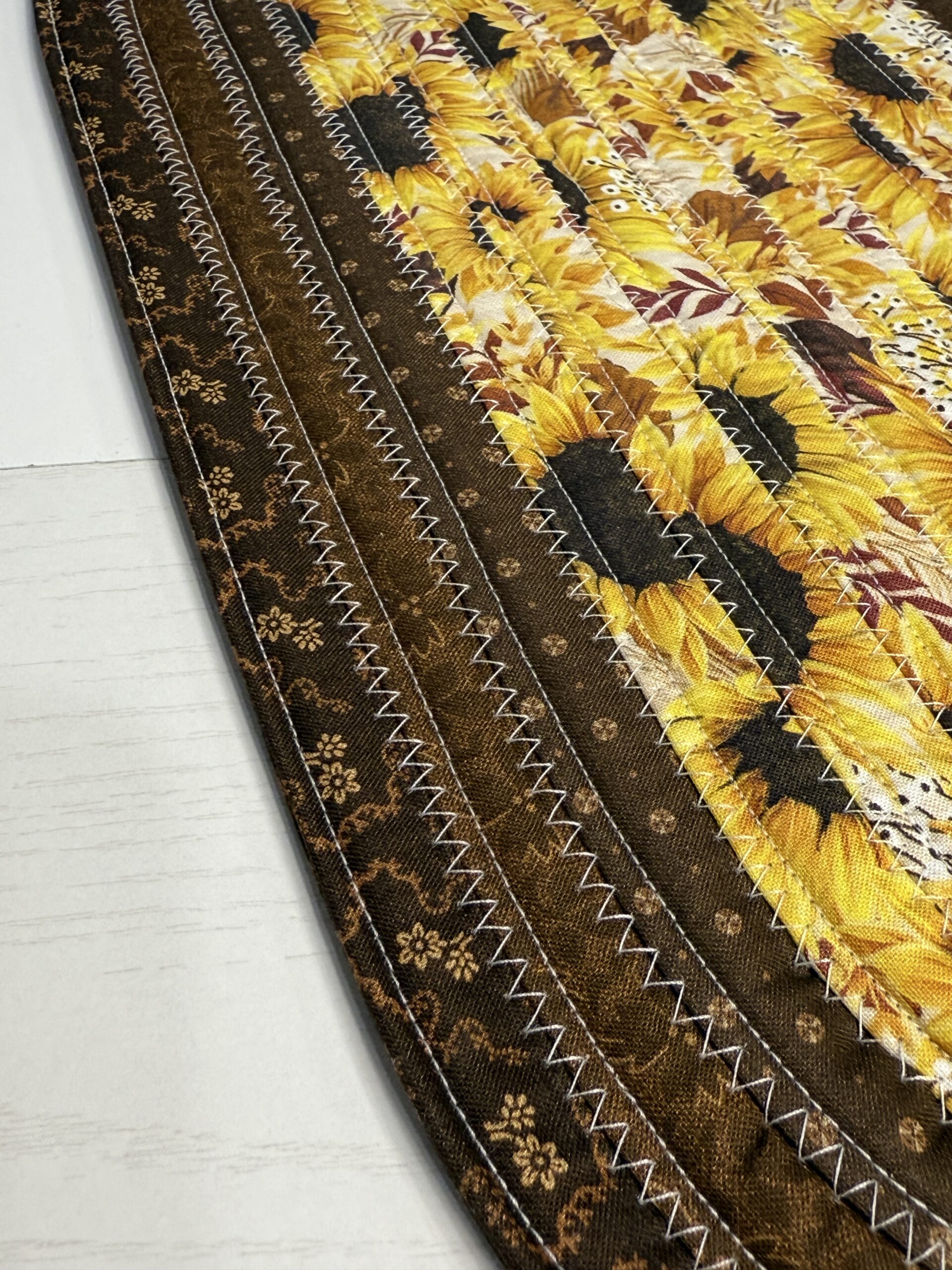 This is a Brown Sunflowers Small Fabric Table Runner/Centerpiece #3 is as shown measuring about 8.5×20″ and is washable. You can place warm items onto when on table.