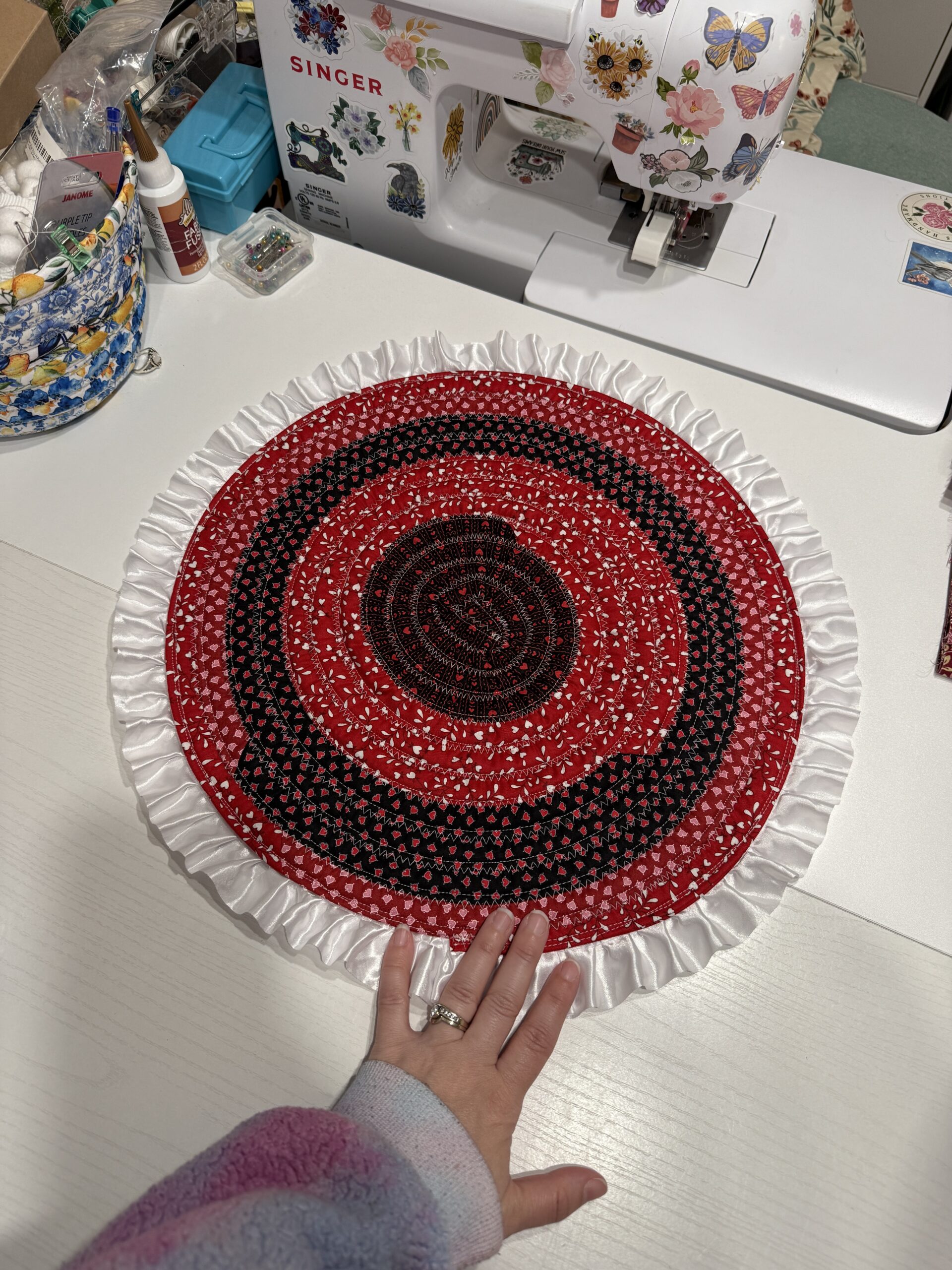 This Red and Black Ruffle Fabric Table Centerpiece 2 is as shown measuring about 18″ with the ruffle edge.