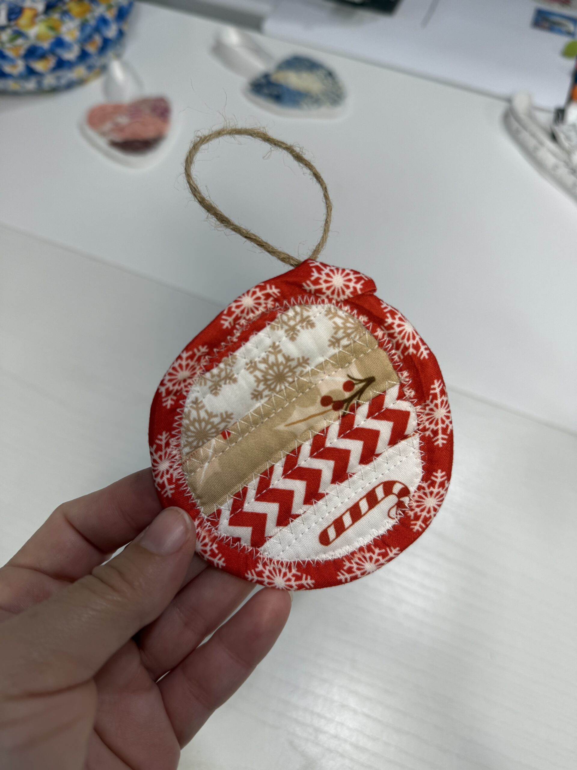 This is a hand sewn as shown Red Fabric Ornament #2 measuring about 3″. Perfect for hanging on your Christmas tree or just for decoration.