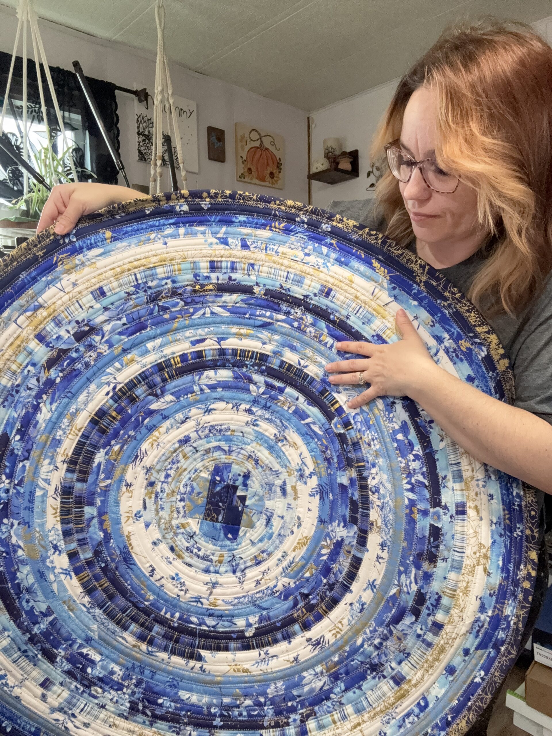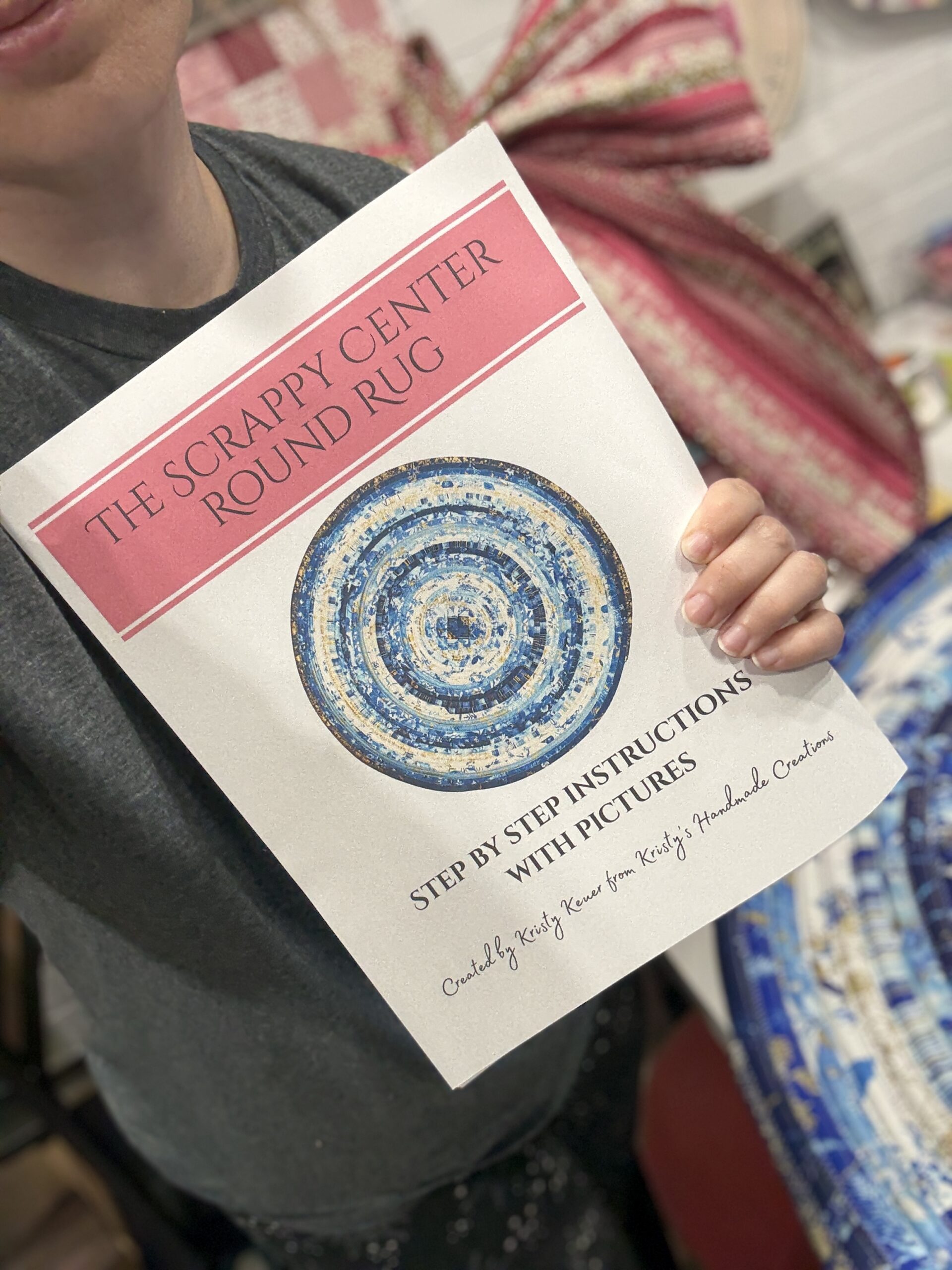 This is for one The Scrappy Round Rug Pattern downloadable printable. It is a tutorial explaining how I make my scrappy center round rug using fabric tubes made from jelly roll fabric strips as well as the triangle cut offs. You can make the center to blend in or stand out! It is a thirty three page tutorial you can print out after purchasing.
