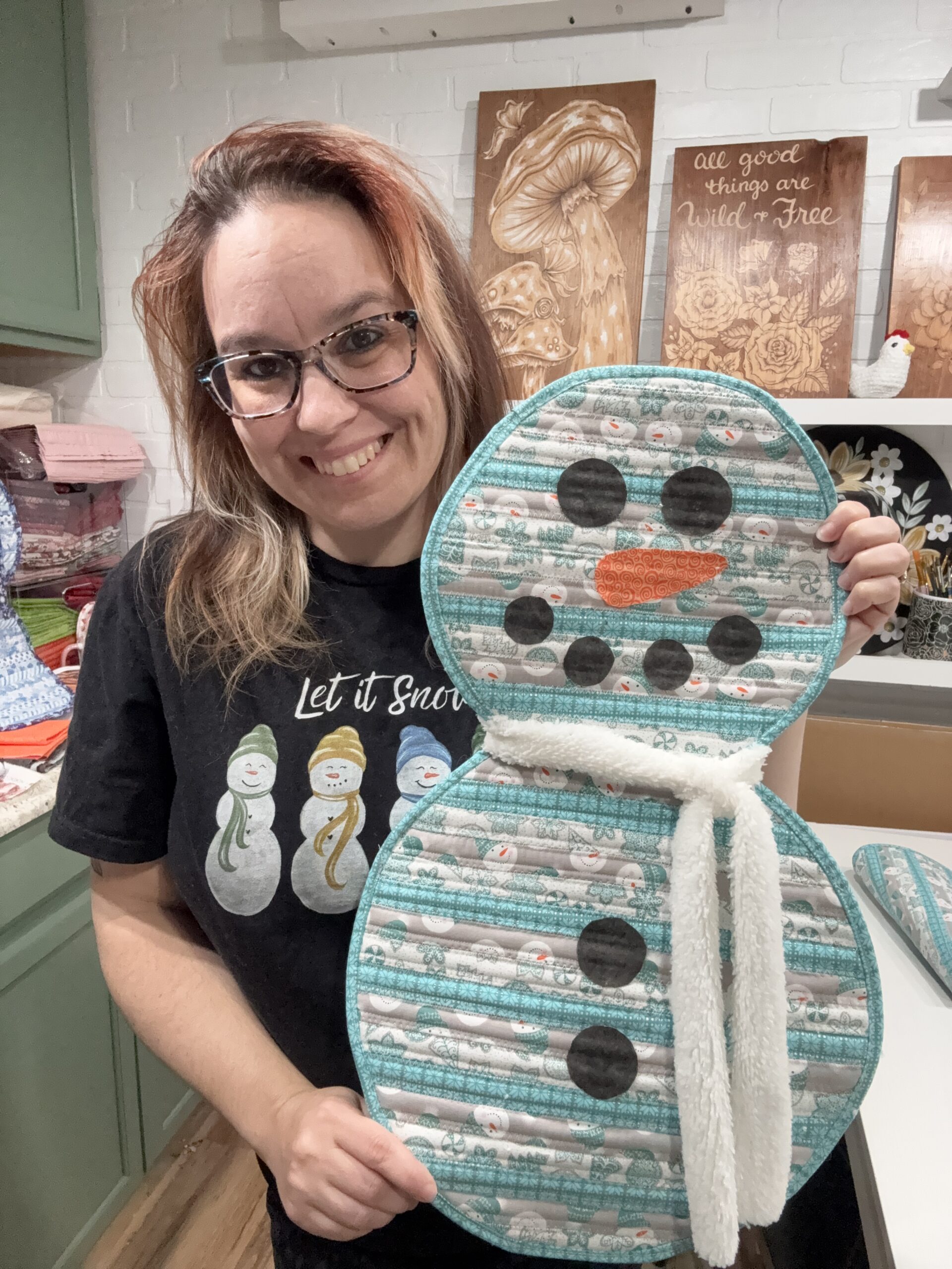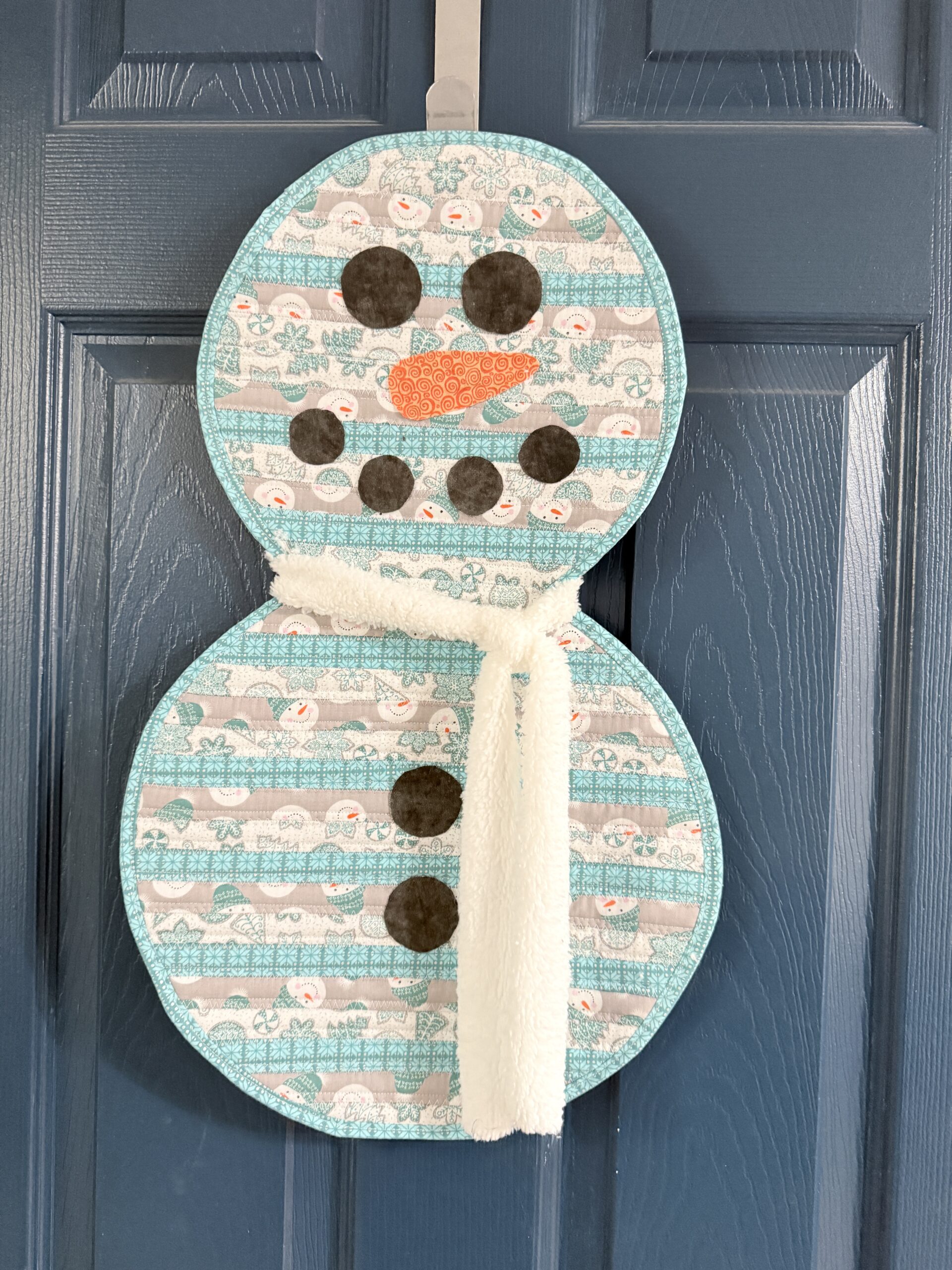 This is a Two Tier Teal Fabric Snowman Door Hanger as shown measuring about 12×21″. Perfect addition to a door or just to hang as decoration in the home.