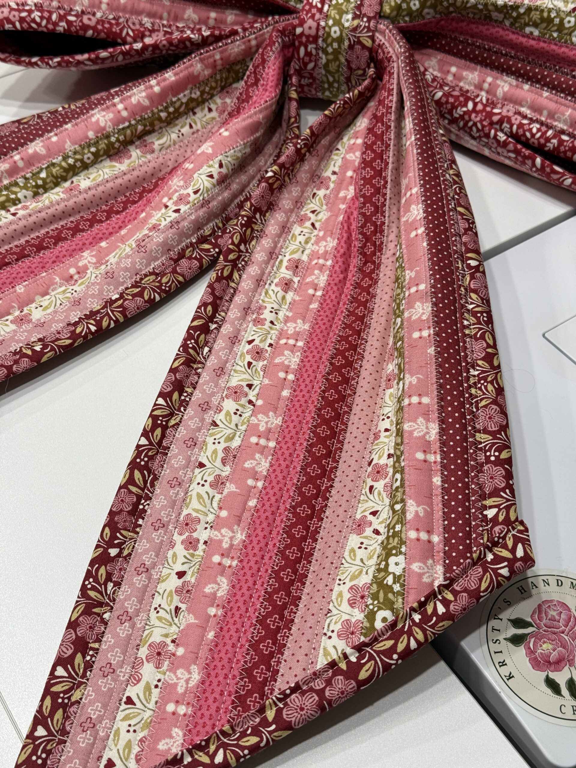 This Valentine’s Pink and Red Giant Fabric Bow is as shown measuring about 20×28″ . Can be hung on a front door covered from the elements, or inside the home as decoration.
